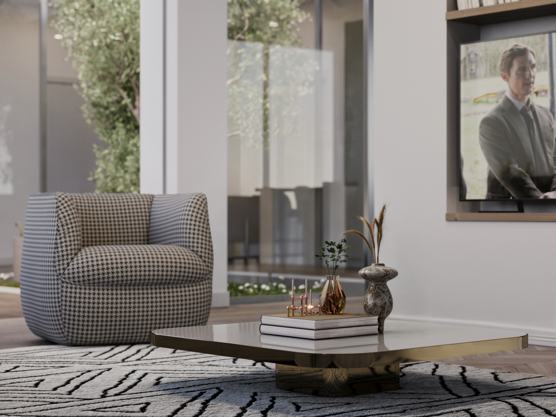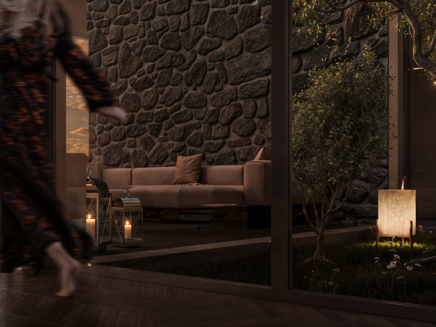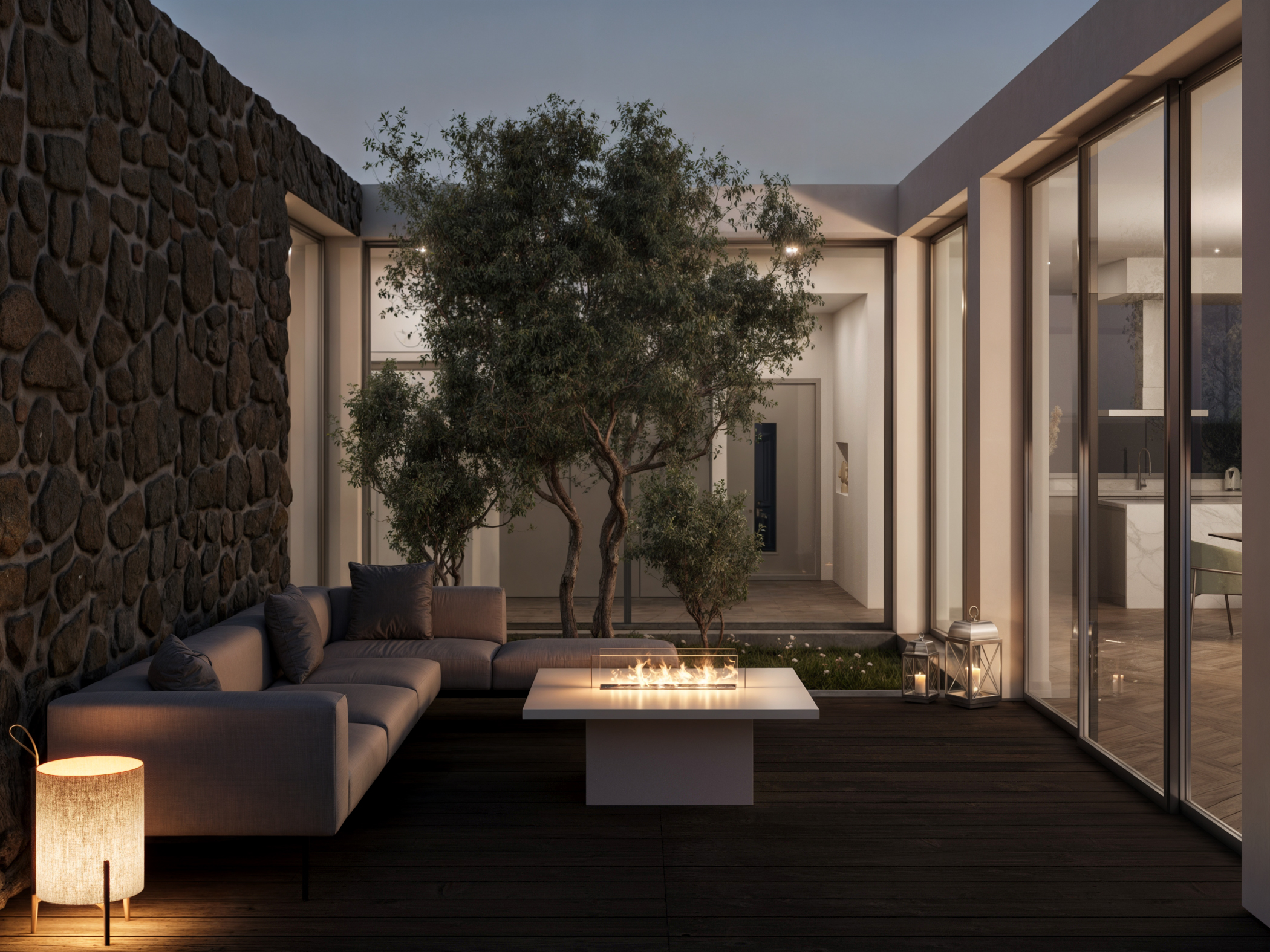 Zona giorno di una villa strutturata intorno ad un patio.